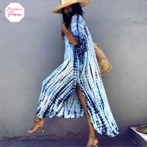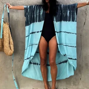 Robe Kimono Tie and Dye Imprimé Ligné Manches Mi-longues