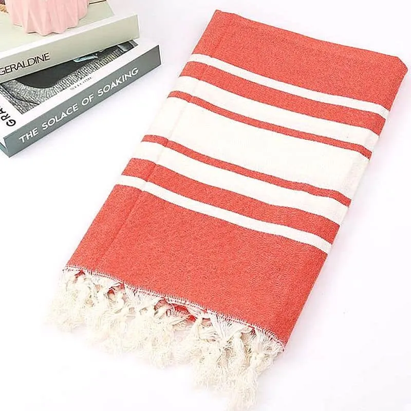 La multifonctionnalité est à l’honneur avec notre fouta de plage à rayures centrées et franges. Vous brillerez en l’arborant comme un élégant pareo, une pratique serviette de plage, ou même un châle sophistiqué. Ses franges élégantes ajoutent une note de raffinement à votre allure balnéaire.