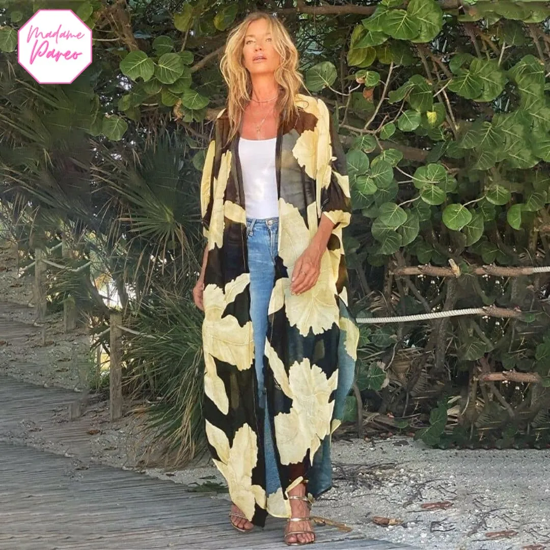 Vous désirez allier charme et fonctionnalité dans vos choix de tenues balnéaires? Notre Kimono de Plage Grande Taille Imprimé Été satisfait à ces deux critères avec brio. Ses fentes latérales esquissent subtilement le galbe de vos jambes tout en offrant une protection contre les ardeurs du soleil. De plus, les manches longues de ce kimono de plage veillent à la préservation de vos bras des rayonnements UV néfastes.