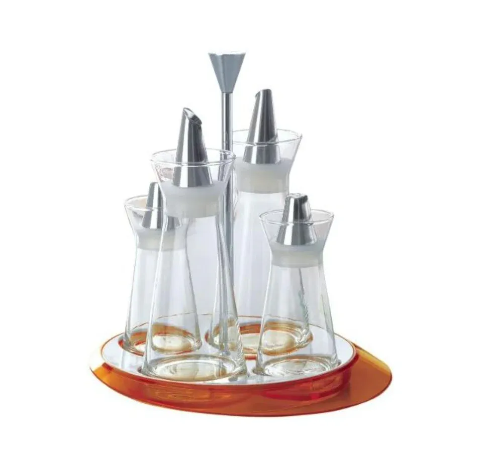 Le fond du support est en plastique acrylique transparent SAN, le récipient est en verre soufflé et les becs verseurs du couvercle sont en acier inoxydable 18-10. Le plastique SAN se caractérise par une surface brillante, une transparence élevée, une résistance chimique et un niveau élevé de propriétés mécaniques et technologiques. Les composants en verre borosilicate sont soufflés à la main et inspectés à 100 %. La présence éventuelle de petites bulles d’air ou d’irrégularités à la surface du verre dépend du procédé de fabrication artisanale du verre soufflé et est normale.