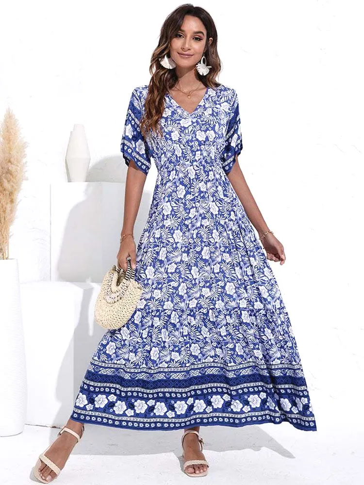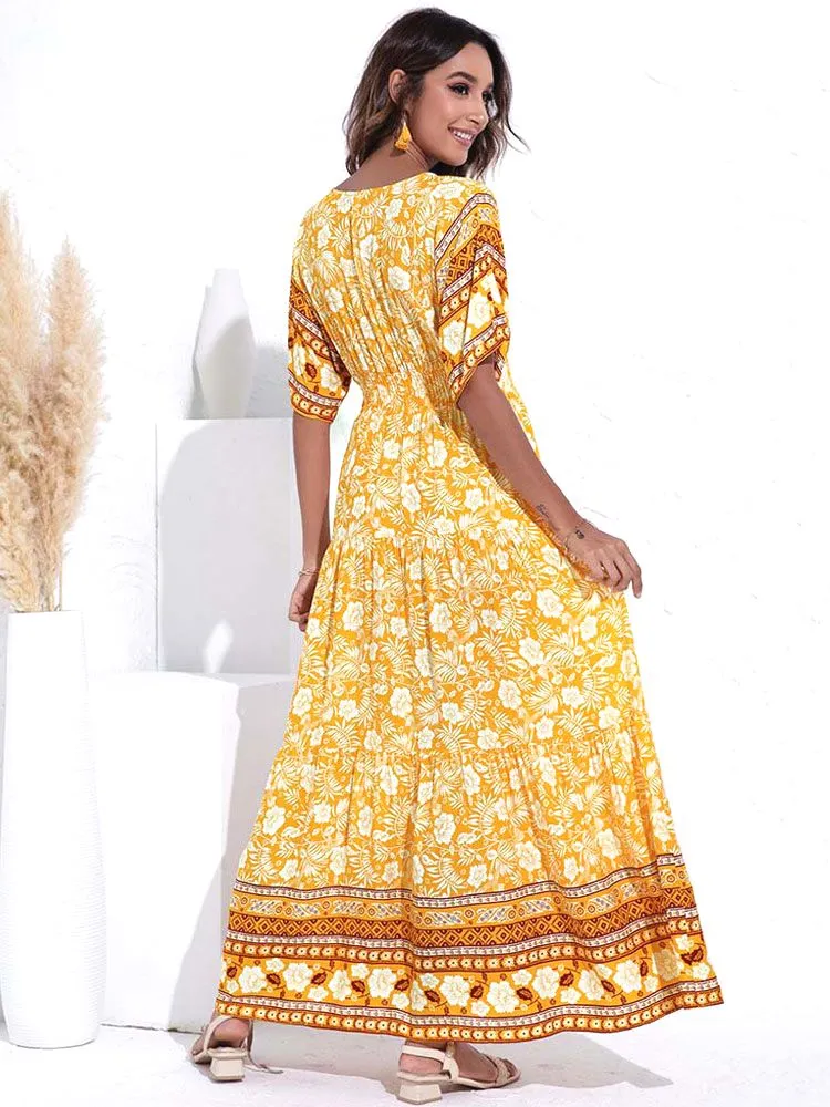 Incarnant l’âme libre de la tendance bohème, cette Longue Robe Bohémienne à Col V et Motifs Fleuris déborde de couleur et de vitalité. Offerte en nuances de bleu, vert et jaune, sa magnificence florale vous enrobe avec éclat et insuffle une dose d’énergie à votre style.