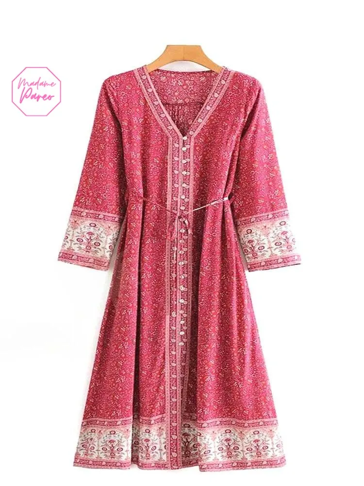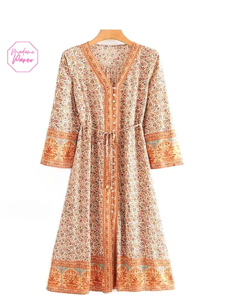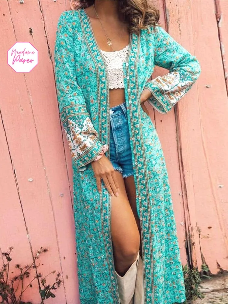 La longue Robe Chemise Bohémienne à Col en V est un festival de confort et d’élégance. Elle se drape gracieusement jusqu’à mi-mollets, avec des volants fluides qui lui confèrent une allure légère et aérienne. De fins boutons s’égrènent le long de son corsage, offrant à la fois style et fonctionnalité.