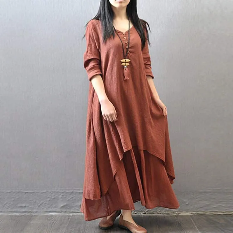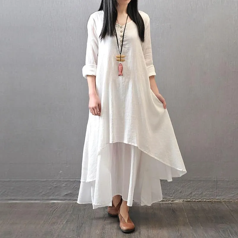 Façonnée avec des matériaux solides pour garantir une longévité exceptionnelle, cette Longue Robe Grande Taille à Col Rond se pose délicatement au niveau des chevilles, offrant un drapé élégant. Une couche additionnelle asymétrique apporte une nuance stylisée qui la distingue.