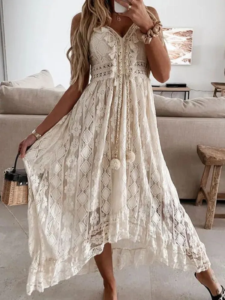 Cette robe reflète l’habileté et la finesse artisanale, fusionnant le chic bohème avec des ornements subtils comme des pompons espiègles.
