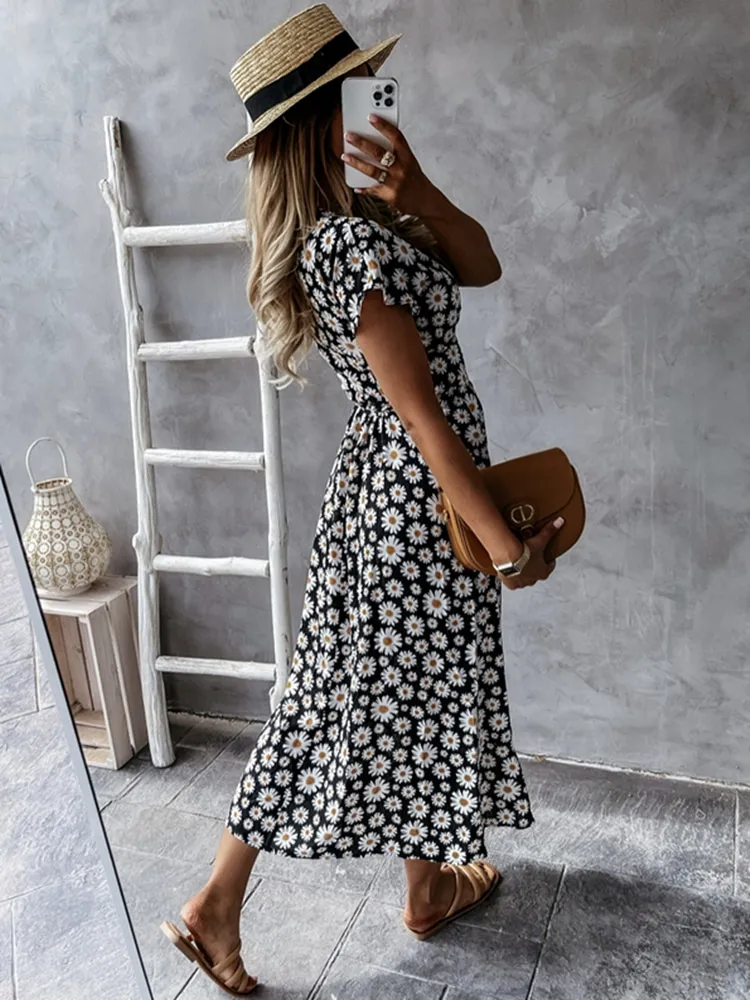 Infusez un esprit rétro dans votre collection de tenues avec notre séduisante Robe Portefeuille Imprimé Floral Style Vintage. Sa confection florale, combinée à des manches courtes et une texture aérienne, incarne l’essence du chic bohème pour un style des plus décontractés mais toujours élégant.