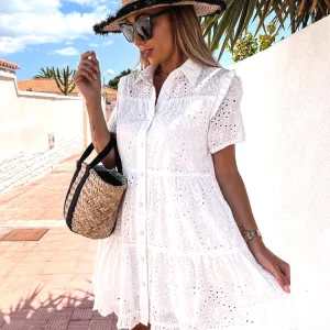 Robe Chemise Blanche Brodée à Manches Courtes